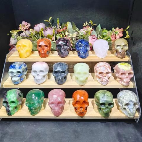 Gran oferta, tamaño pequeño, tallado a mano, fluorita, cuarzo rosa, obsidiana, cristal de cuarzo transparente, Calaveras, artesanías de cristal para regalo de Halloween
